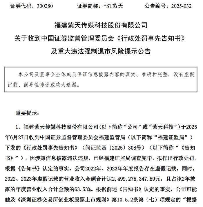 同时,根据今年6月27日中国证监会对紫天科技下发的《行政处罚事先告知书》,紫天科技2022年、2023年年度报告存在虚假记载,2022年、2023年虚假记载的营业收入金额合计近25亿元,且占该两年披露的年度营业收入合计金额的63.53%。