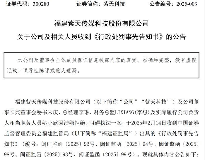 “紫天科技无正当理由不按要求报送文件资料,已构成拒绝、阻碍执法行为,严重影响福建证监局对其有关检查工作正常进行,情节严重。”福建证监局表示。