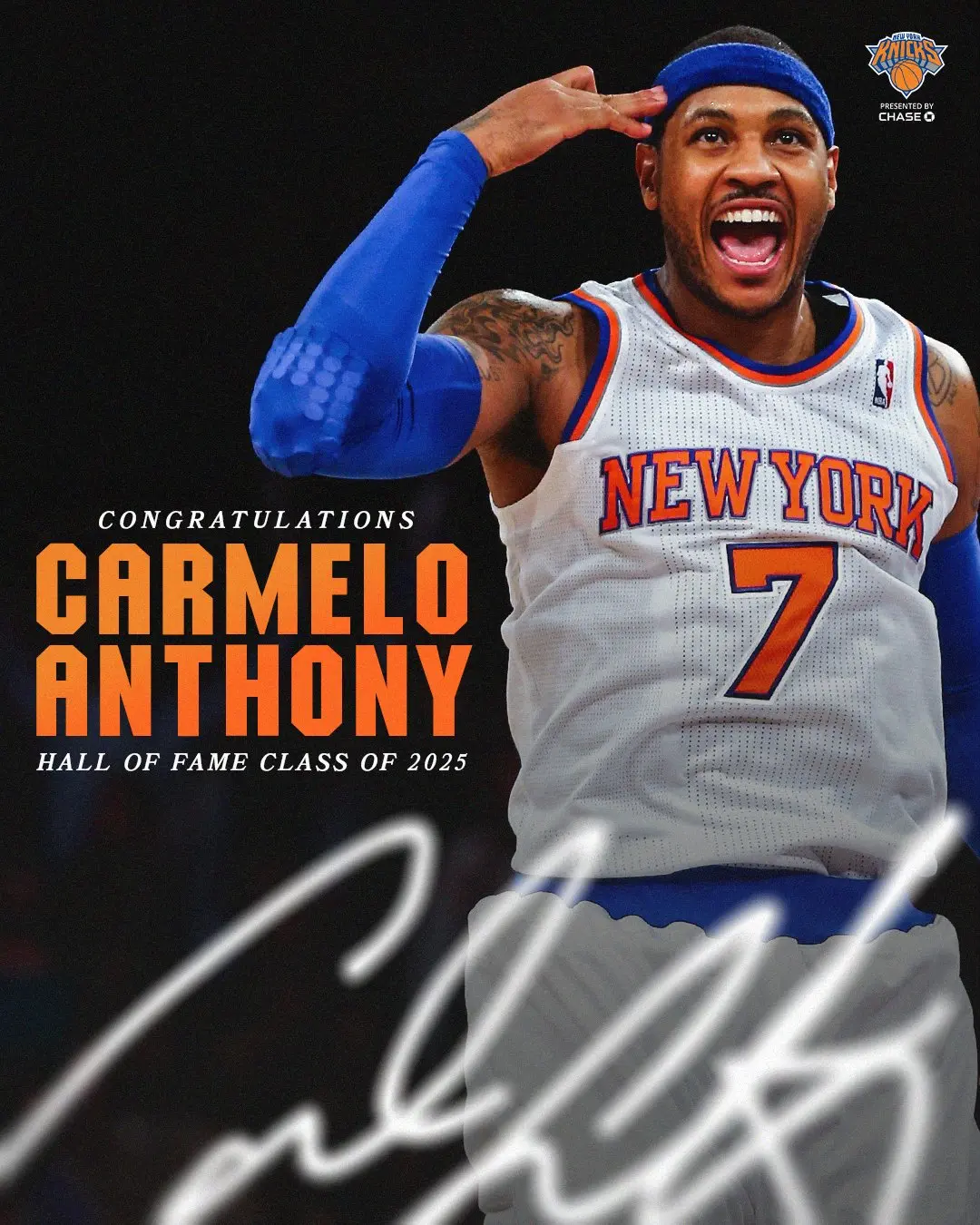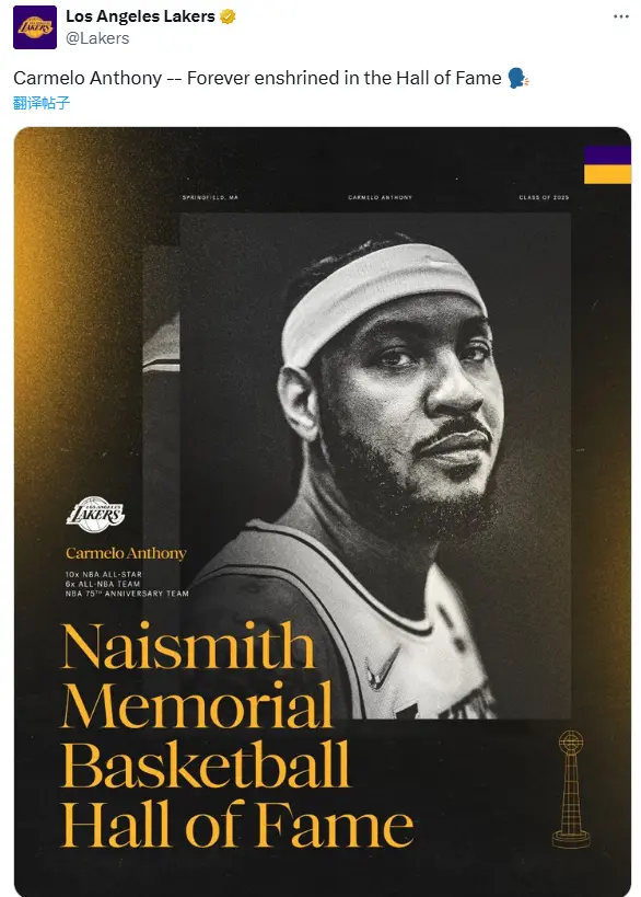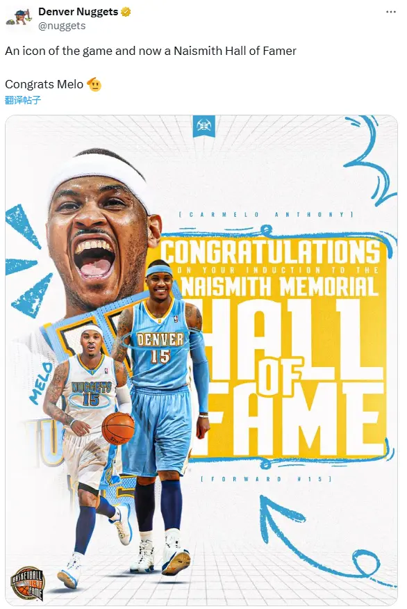 湖人、掘金、尼克斯等队官方祝贺安东尼进入名人堂,掘金官方写道:篮球界的传奇人物,如今荣登奈史密斯名人堂,恭喜甜瓜。